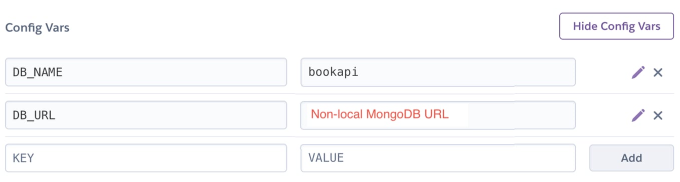 Before deploying, you may want to add your env vars to the app config for anything required to run your application. In the Heroku dashboard, navigate to the app’s settings page to add these.